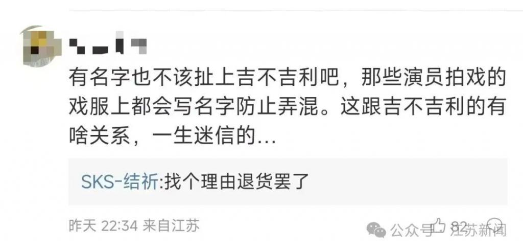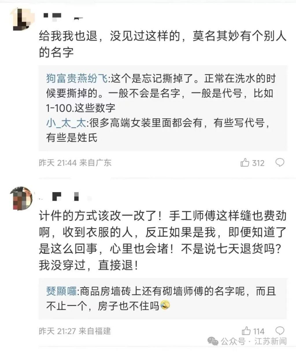 首页 > 生活 女子发现网购大衣上有手写名字,“觉得瘆得慌直接退货” 近日,福建龙岩林女士的母亲在直播间网购了一件大衣,试穿时发现衣服上竟缝有手写姓名条,觉得过年期间不太吉利,便选择退货。没想到帖子发出后,有网友科普:这类手工缝制的大衣,师傅会缝上自己的名字用于计件考核,出现质量问题也能精准返工,反而更有保障。知道真相后,不少网友纷纷留言求直播间链接。部分网友表示对这种情况并不介意部分网友表示接受不了对此你怎么看?