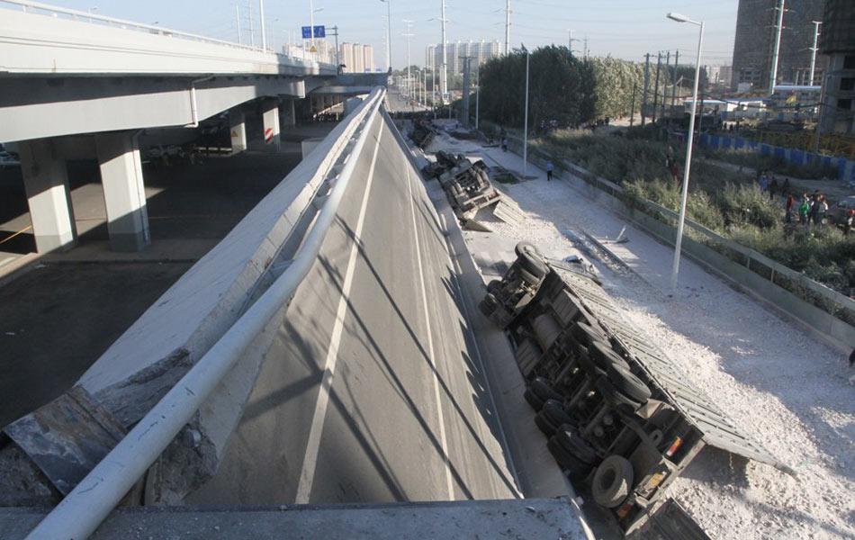 由于这种桥梁采用单柱支撑,当近 200 吨的重量全部压在桥梁的一侧时,产生了巨大的倾覆力矩,导致桥面板像翘翘板一样瞬间翻滚落地,最终造成 4 人死亡,8 人受伤。