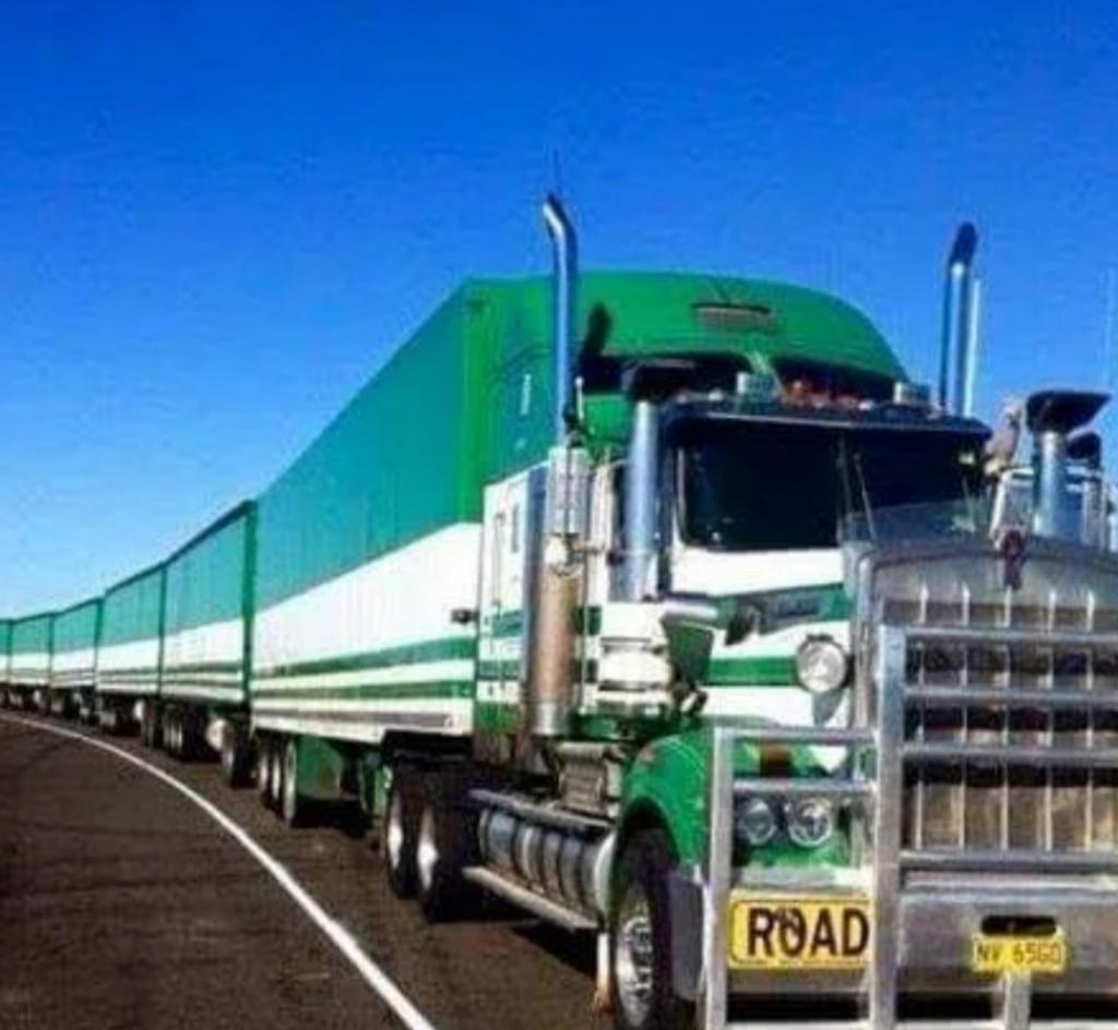 由于澳洲重卡允许加装货箱,只要拉得动,方能按货加箱,于是卡车头成了火车头,开在路上,真成了列车模样。