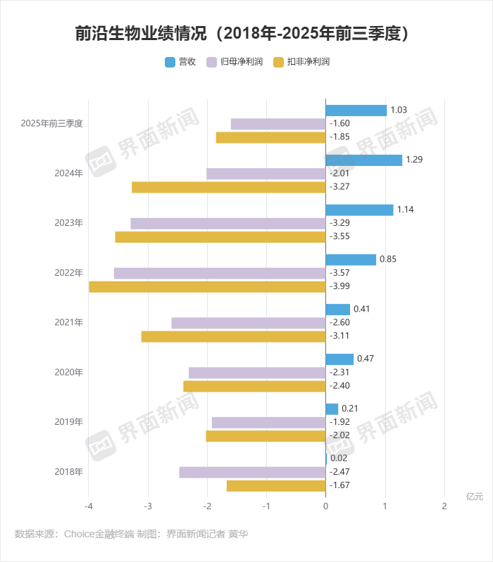 但从商业化成绩来看,艾可宁的收入已难以支撑前沿生物的发展。财务数据显示,2020年-2024年,前沿生物的营收从4000万元突破至1.2亿元,但扣非净利润持续亏损,累计亏损超17亿元。