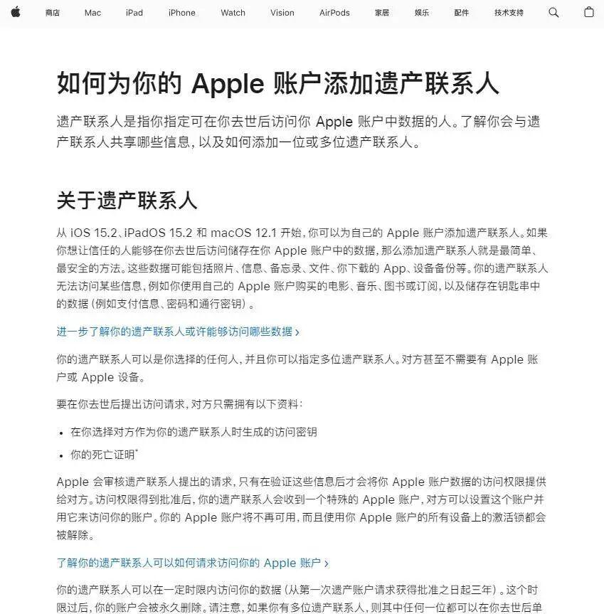 苹果官方网站显示," 遗产联系人 " 是指用户指定的可在该用户去世后访问其 Apple 账户中数据的人。据介绍,若用户希望信任的人在其去世后能访问自身 Apple 账户中的数据,可指定一人或多人作为遗产联系人。此外,遗产联系人需持有用户指定其为联系人时生成的访问密钥,以及用户的死亡证明,便可以申请在一定时限内访问用户的数据。