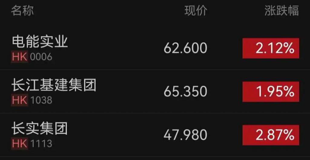 截至发稿,长江基建集团涨 1.95%,电能实业涨 2.12%,长实集团涨 2.87%。