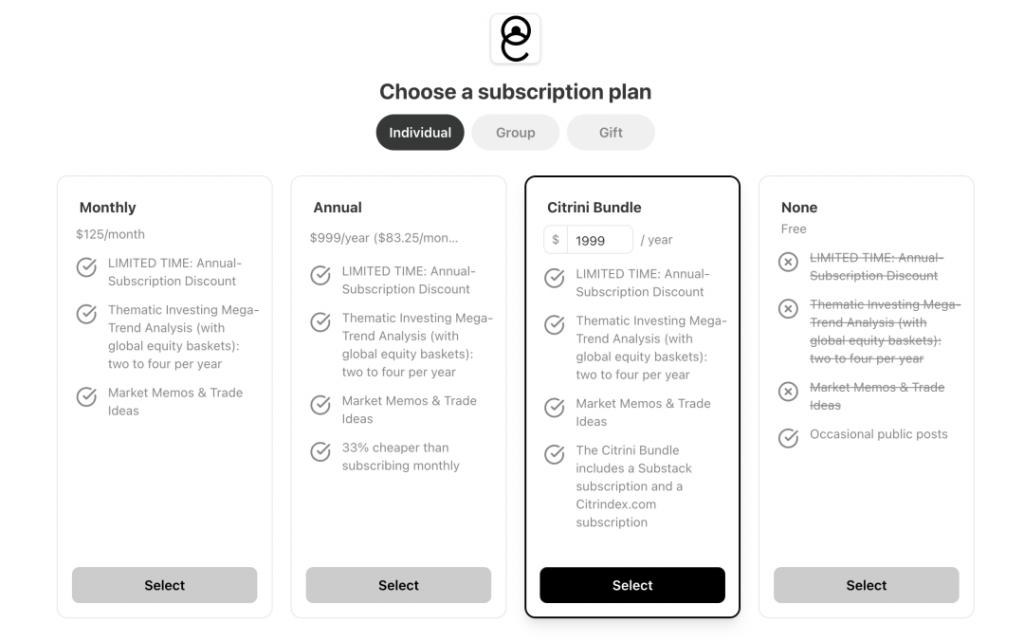 这让吉伦一战成名,迅速在金融圈建立起声誉。随后,他在内容付费平台 Stustack 上创立了自己的投资分析品牌 Citrini Research,吸引了大量订阅者。
