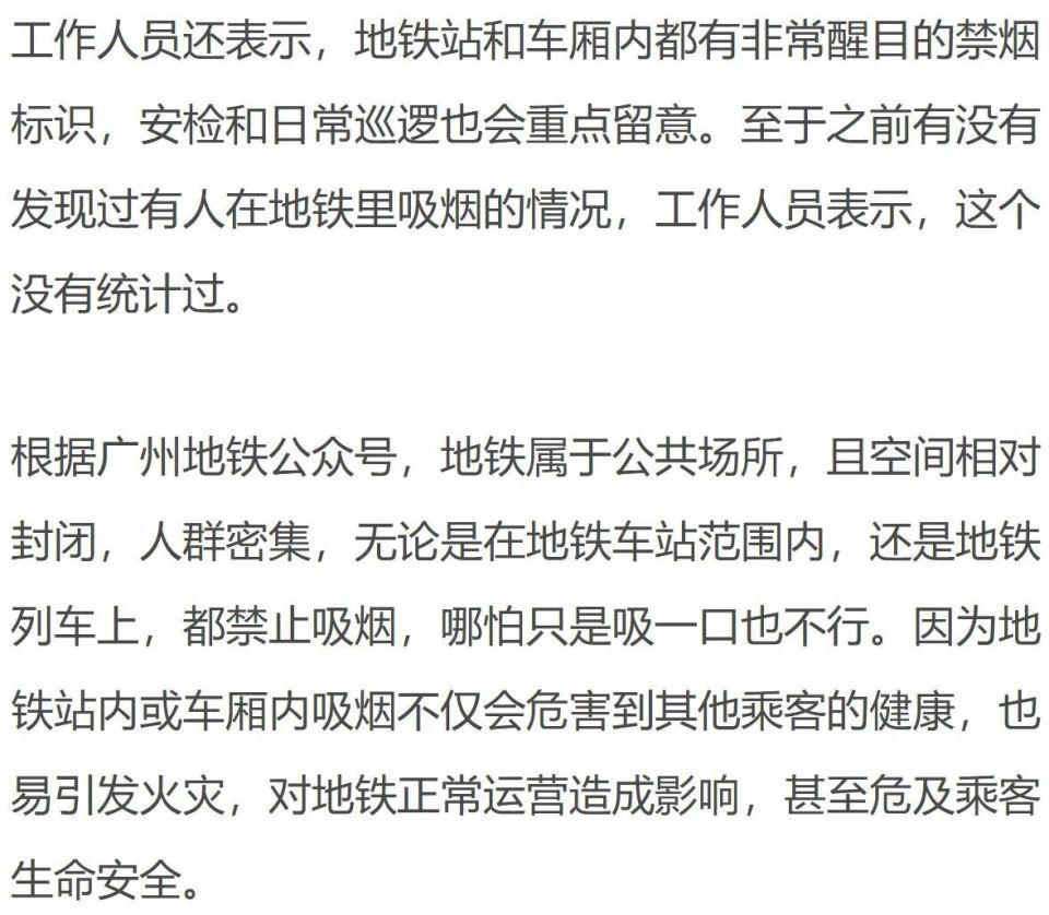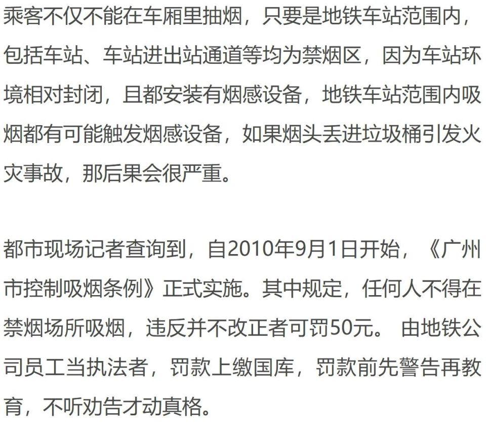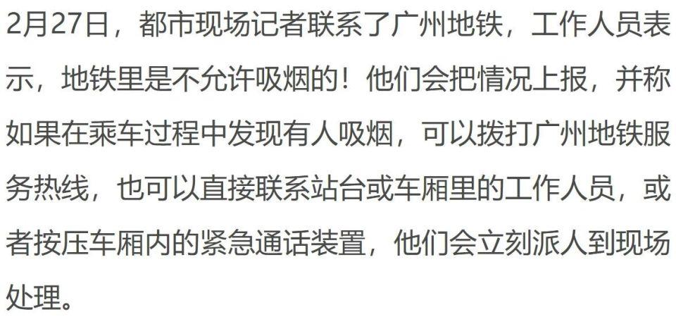 首页 > 生活 广东广州地铁车厢内一女子淡定抽烟,无人制止,拍摄者当场用粤语怒怼;广州地铁回应 2 月 26 日,有网友发布视频称,她在广州地铁里看到一女子淡定地抽烟,当时车厢里没有一个人制止,也没有工作人员在场。这位热心的小姐姐果断上前,礼貌又不失气场地说了一句:" 能不能把你的烟掐掉啊?"没想到,这名吸烟的女子只是淡定地用粤语回了一句话。这一下,小姐姐的 " 战斗欲 " 被激发出来了,她随即用流利的粤语回怼。来源 : 都市现场 版权归原作者所有