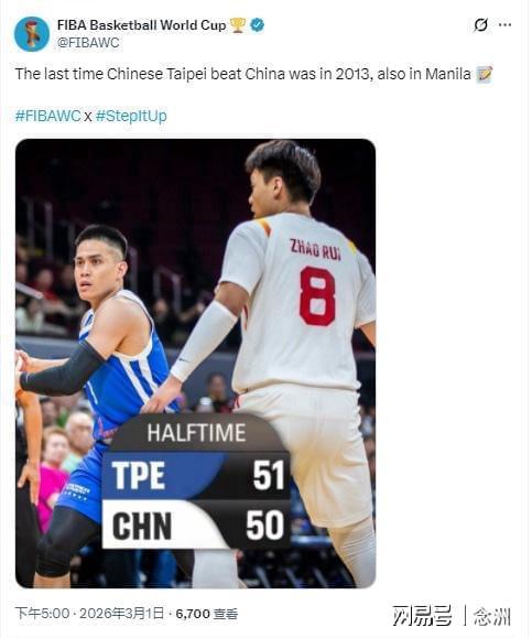 本场比赛,中国男篮上半场 50-51 落后中国台北,FIBA 世界杯官方账号已经蠢蠢欲动,列出上一次中国台北击败中国男篮的历史:2013 年,也是在马尼拉!