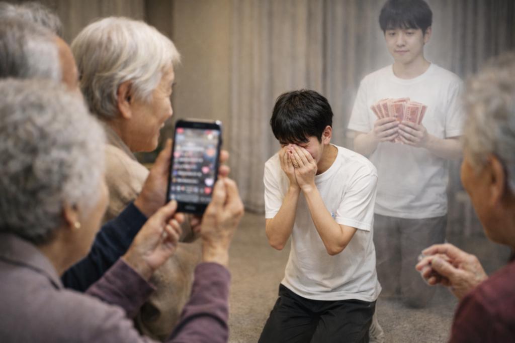 这就是如今随处可见的 " 孝子直播间 "" 情感主播 ",一场以剧情化短视频、直播 " 演戏 " 为核心的流量生意——他们有人在镜头前扮演调解家庭纠纷的 " 正义使者 ",有人以民族大义、灵异玄学为剧情主线吸引观众,最终却都导向同一个目的:卖货、卖课,或者把观众引导进更隐蔽的私域交易。