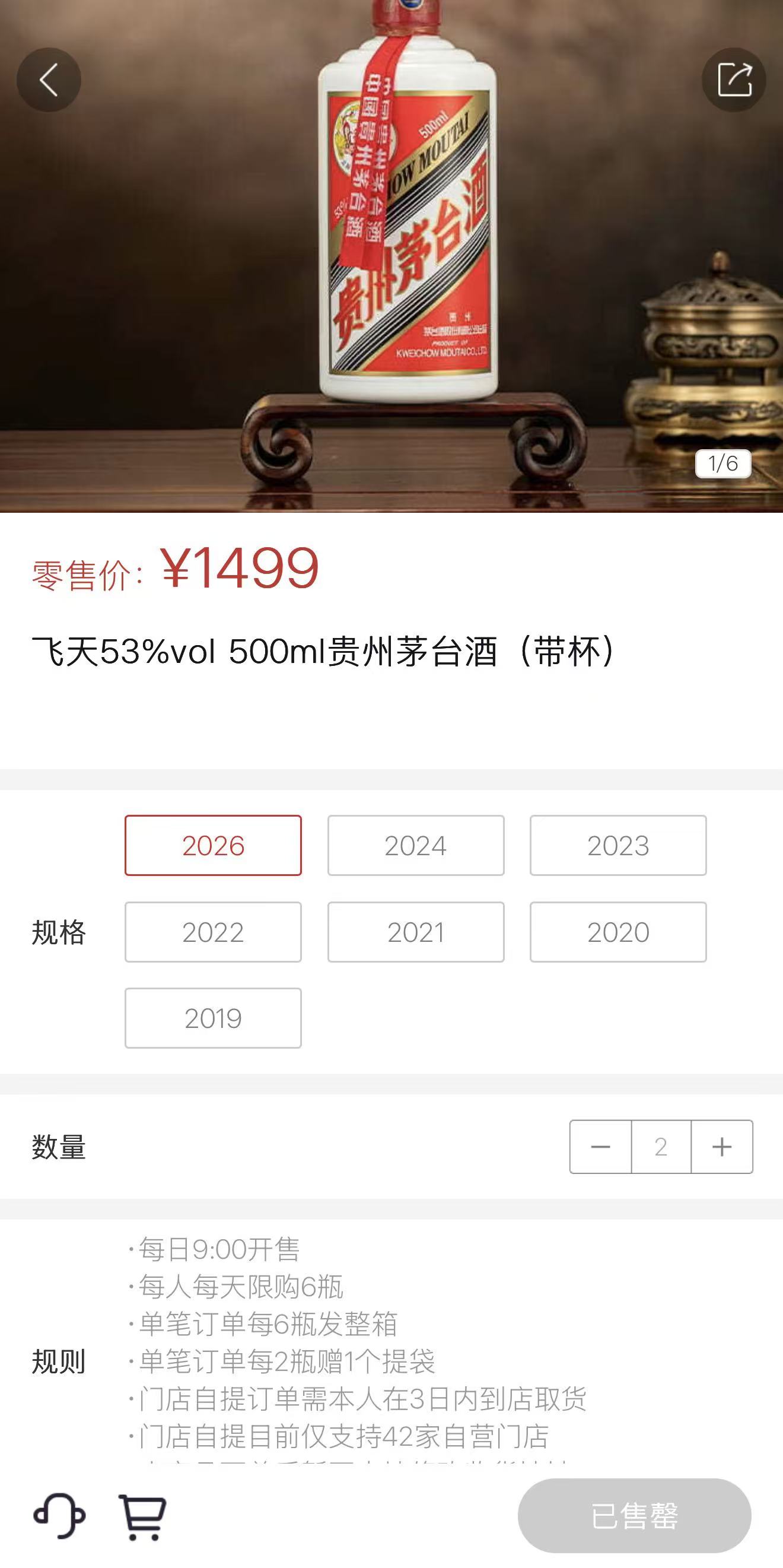 记者查阅贵州茅台自营电商平台“i茅台”,2026年飞天茅台53度500ml售价仍为1499元,每日9:00开售,每人每天限购6瓶;当日已经售罄。此外,从2019到2024年的年份酒也已抢光,该品类每月9日、19日、29日9:00开售。