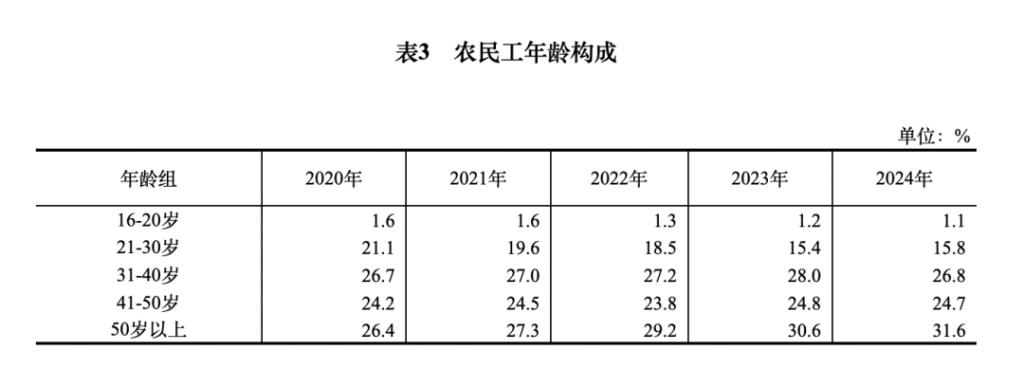 国家统计局发布的《2024 年农民工监测调查报告》也能透视其中的一角,报告显示,全国农民工平均年龄 43.2 岁。其中,50 岁以上的农民工占近三分之一,约 31.6%。