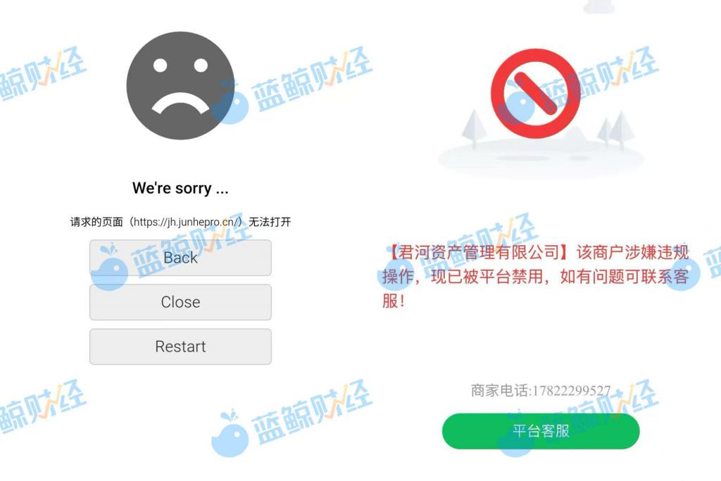 记者实测受访对象提供的君河资产下载二维码,链接页面显示 " ‘君河资产管理有限公司’该商户涉嫌违规操作,现已被平台禁用,如有问题可联系客服!"