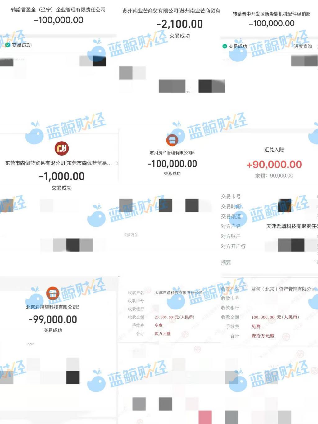 根据投资人提供的交易信息,记者发现,该骗局的主要收款账号指向君河(北京)资产管理有限公司(下称 " 君河资产 ")、北京君翔耀科技有限公司(下称 " 君翔耀 ")、天津君鼎科技有限责任公司(下称 " 君鼎科技 ")等 " 君 " 字系企业以及机械配件、商贸公司等分散在各地的各类中小企业,使得受害者的资金在极短时间内被拆分流转。