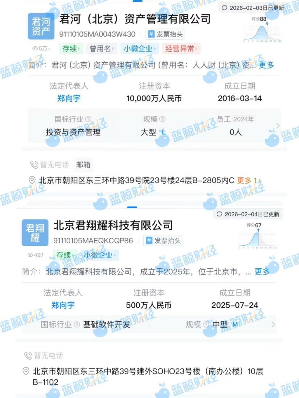 天眼查信息显示,君河资产、君翔耀的注册地址均指向北京朝阳建外 SOHO 办公楼,法定代表人均为郑向宇。股权结构上,君河资产持有君翔耀 80% 股份,系控股股东;君盈全则由君河资产与君盈证券各持股 50%,君盈证券与君盈全的法定代表人同为王欢。