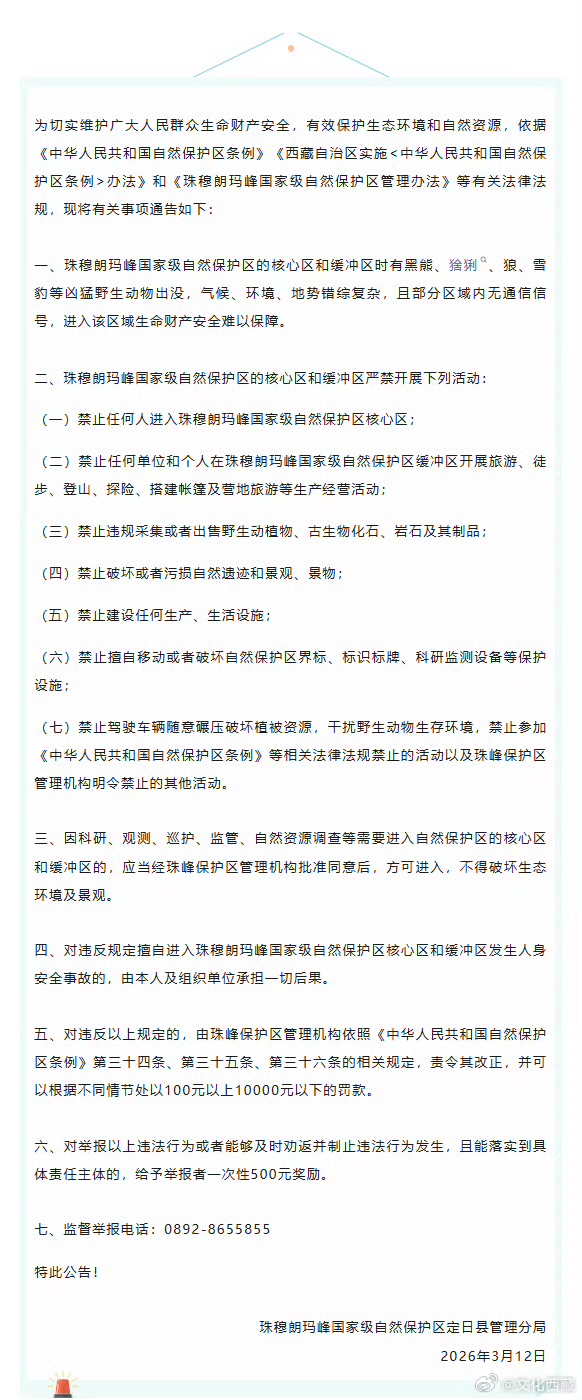 微博账号“文化西藏”转发的《关于禁止在珠穆朗玛峰国家级自然保护区定日县管理区域的核心区和缓冲区开展登山、徒步、旅游探险等活动的通告》显示: