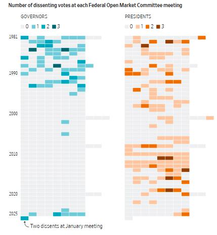 值得注意的是,美联储理事投下的反对票与美联储其他决策者投下的反对票分量不同,其原因在于组织结构。美联储理事只要在任内,就具有 FOMC 的永久投票权,而地区联储主席的投票权则会每年轮换。