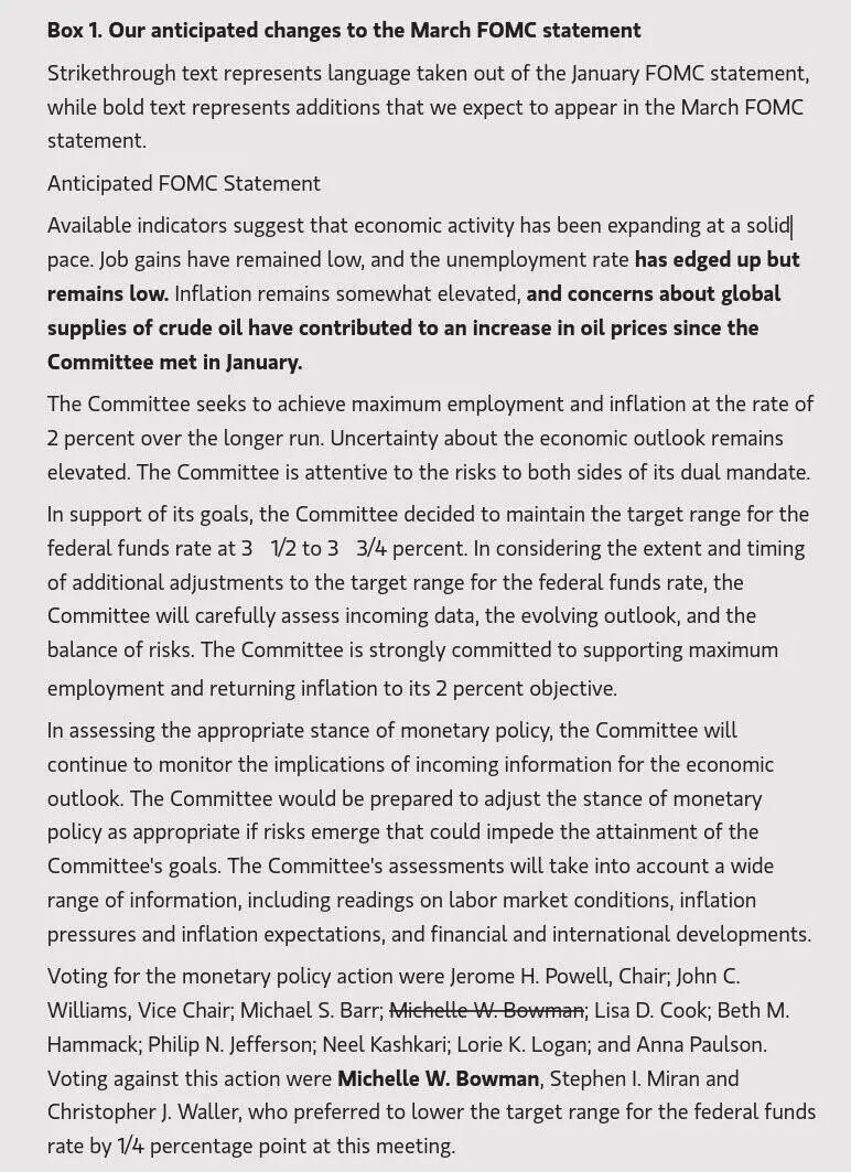 高盛认为,FOMC 声明可能会承认伊朗战争增加了前景的不确定性,并可能在短期内推高通胀并拖累经济活动。声明还可能将活动增长描述为 " 温和 " 而非 " 稳健 "。鉴于最新的就业消息,委员会可能会适度下调其对劳动力市场的描述。