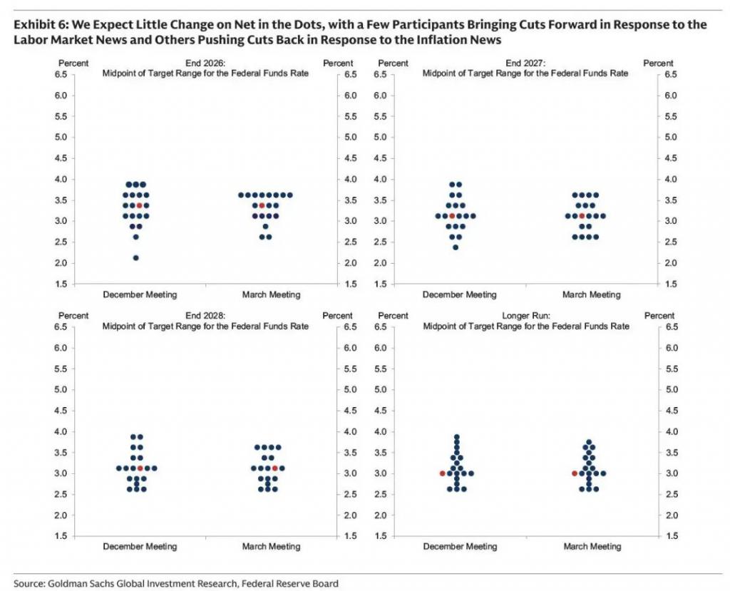 高盛预计,今晚最新点阵图显示的 2026 年利率中位数可能会落在 3.25% 至 3.50% 之间,而 2027 年、2028 年及更长期利率的可能会落在 3.00% 至 3.25% 之间。