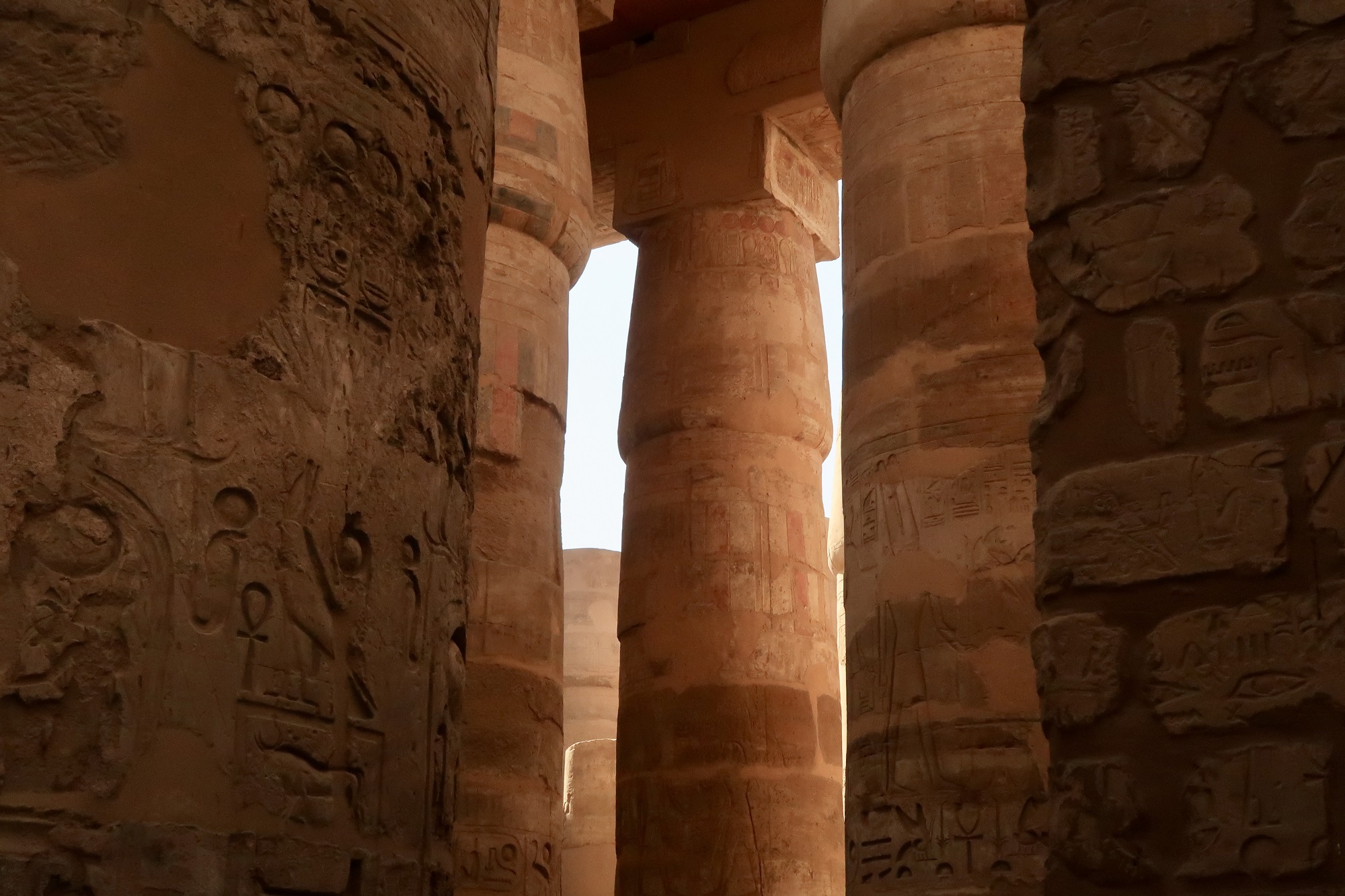 步入其中,两侧由巨石堆砌而成的石柱,拔地而起,每一根柱身上都刻画着创世神话与法老的功绩,历经千年依旧清晰可辨。阳光斜射入柱廊,光影在石柱间跳跃,光斑落在石面上,既有岁月的沧桑,又有生命的灵动。