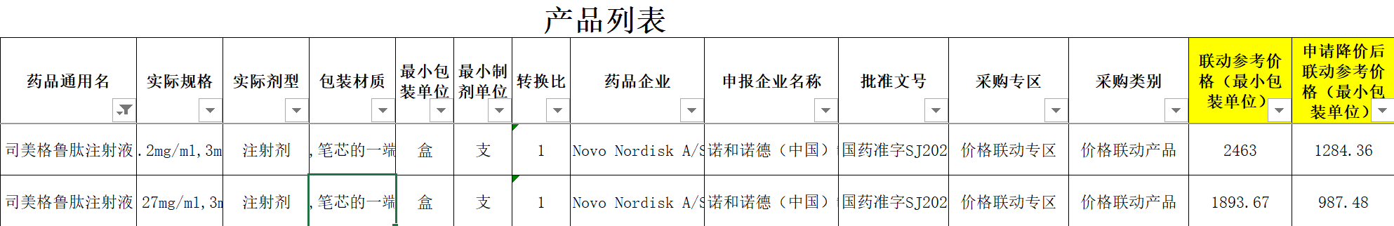 如2025年12月底,据四川省药械招采中心公示的药品降价信息,3.2mg/ml×3ml、2.27mg/ml×3ml两个规格的司美格鲁肽注射液分别降价至1284.36元/支、987.48元/支,价格几乎腰斩。