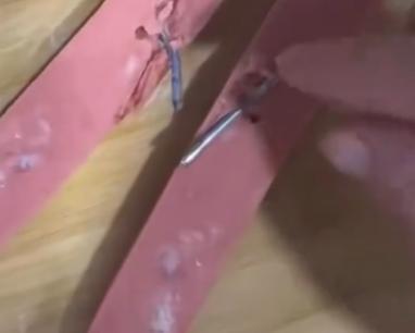 发现异样后,王先生并未直接食用,而是小心将火腿肠切开查看,结果发现两根完整的钢钉牢牢嵌在火腿肠内。