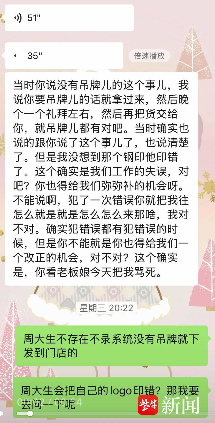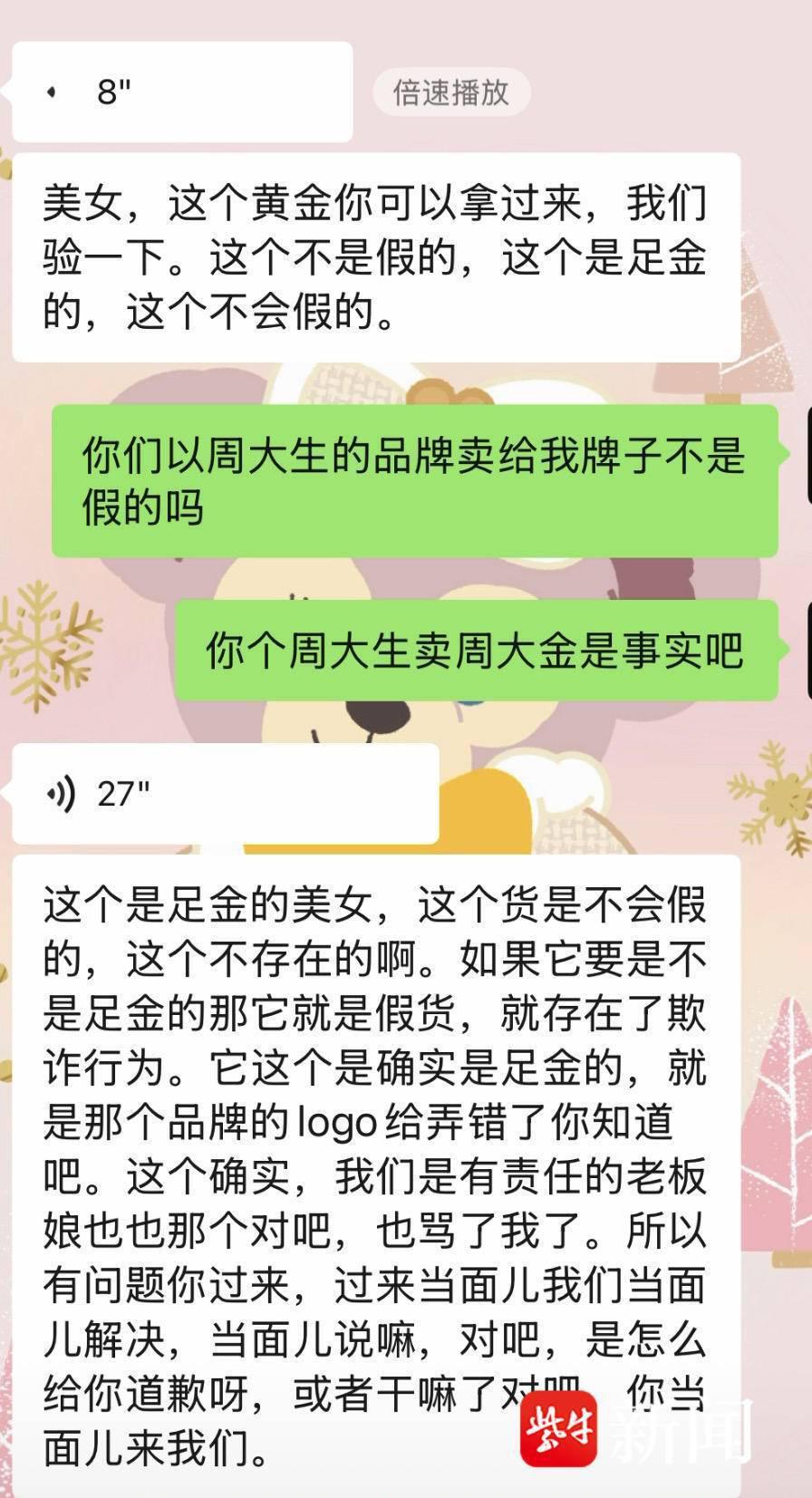 吴女士的闺蜜也晒出自己购买的戒指和票据表示拿到的戒指确实印着 " 周大金 "。从吴女士提供的和门店店员的聊天记录和录音中得知,门店店员曾表示:" 货是足金的,肯定不是假的,只是钢印印错了,是我们的失误,我们确实有责任,请求给弥补的机会。"