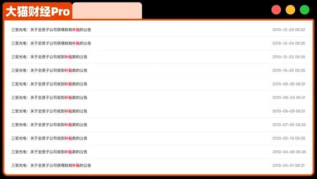 坊间猜测不少,说是跟补贴相关,毕竟三安有个绰号是 A 股的 " 补贴之王 ",上市之后拿了 110 多亿的补贴,很多大国企看了都眼红。