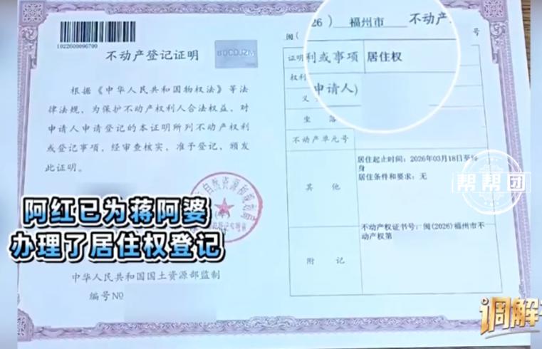 为彻底打消阿明的顾虑,调解员给出建议:由阿红为蒋阿婆办理房屋居住权登记。