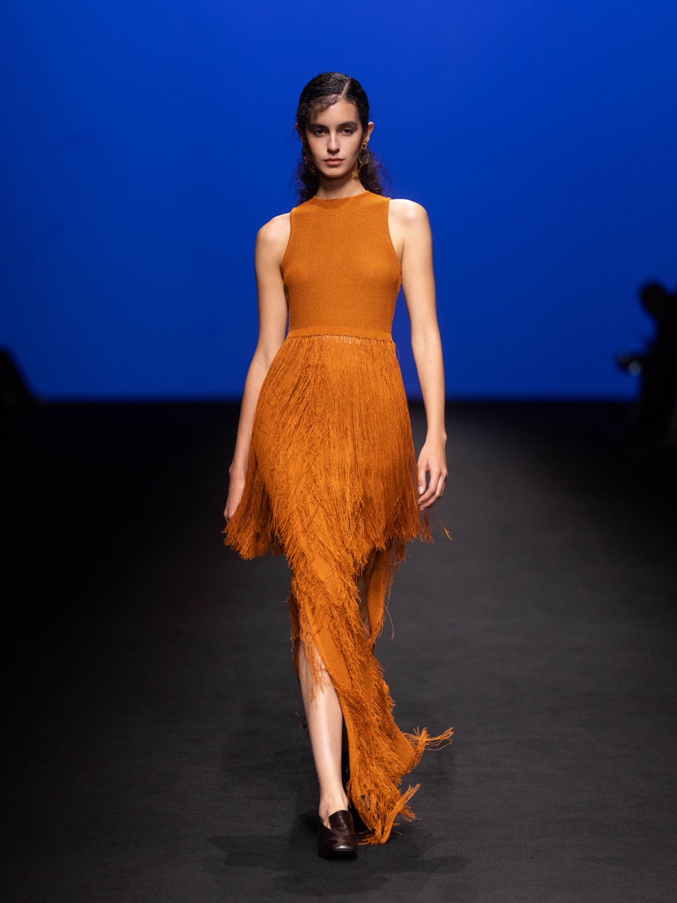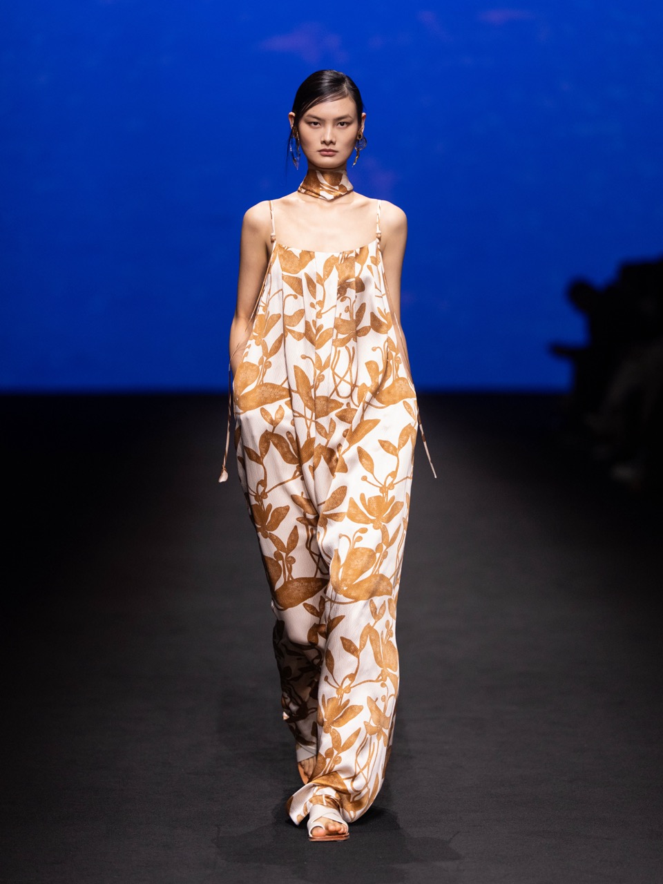 在结构与材质上,系列强调肌理的生成逻辑:通过不同纱线混织,模拟墙面与树皮的触感;同时以雪纺与醋酸、欧根纱形成虚实对照,使轻盈与厚重并置。花卉元素并未直接复刻,而是以更抽象的方式融入面料与纹样之中,延续品牌一贯的克制浪漫。另一条叙事来自游牧文化。围裹式结构、立体口袋与流苏细节,使服装在都市语境中引入一种流动与迁徙的意象。