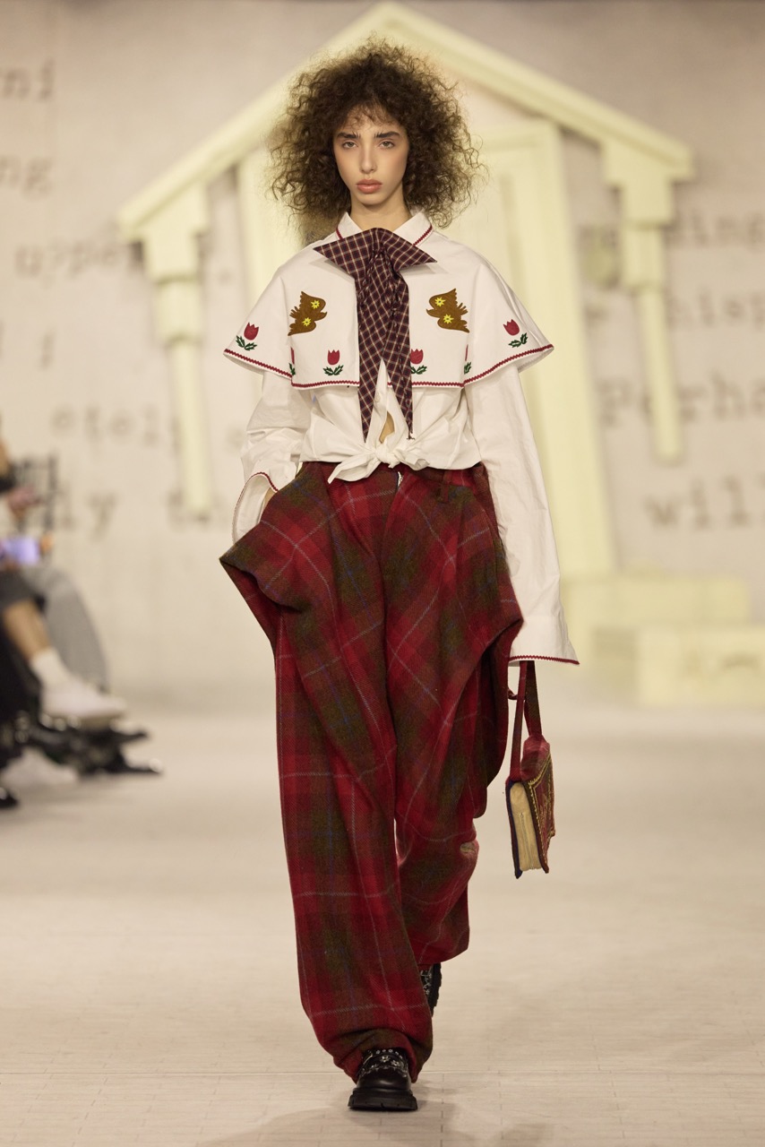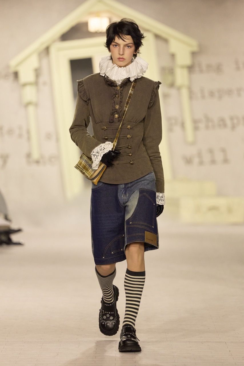 YANAG以“当我长大后”为题,将一个日常提问转化为整季叙事的起点。秀场被构建为一本被时间翻开的旧书。泛黄的故事页铺满墙面,散落的童话房子装置让空间介于现实与想象之间,模特穿行其中,形成一种安静却带有冒险感的氛围。