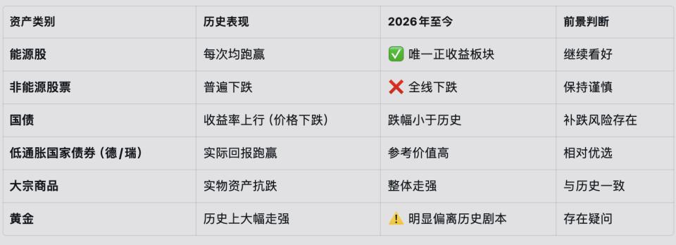 中东战争硝烟未散,全球市场正以一种似曾相识的方式运行——这套剧本与 2022 年能源危机和 1970 年代石油危机高度重叠:股债双杀、能源股一枝独秀、实物资产抗跌。但目前的跌幅远未达到历史同类事件的量级。