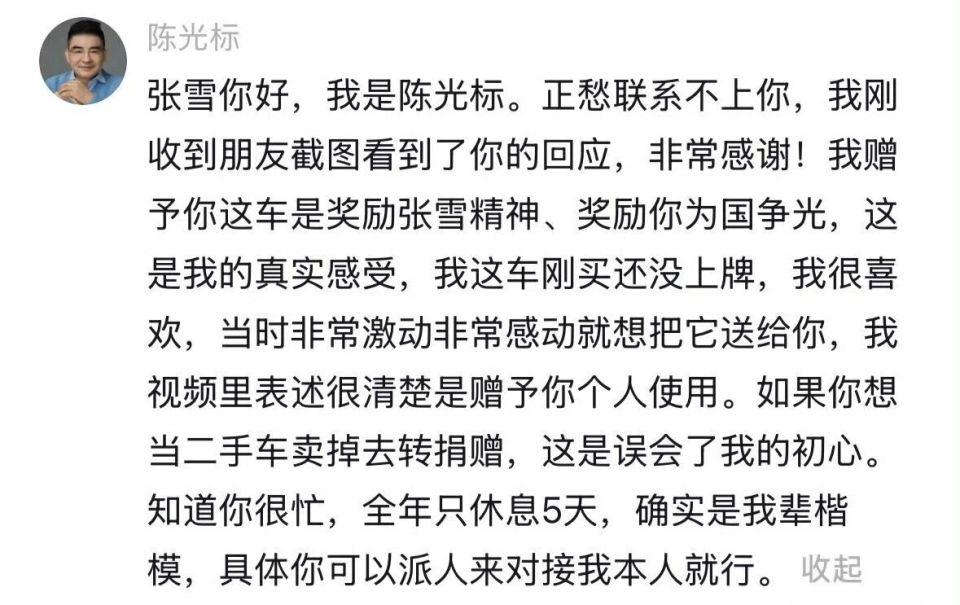 4 月 2 日,就张雪想卖陈光标赠送豪车给嫣然捐款,陈光标在评论区给张雪留言:" 张雪你好,我是陈光标。正愁联系不上你,我刚收到朋友截图看到了你的回应,非常感谢!我赠予你这车是奖励张雪精神、奖励你为国争光,这是我的真实感受,我这车刚买还没上牌,我很喜欢,当时非常激动非常感动就想把它送给你,我视频里表述很清楚是赠予你个人使用。