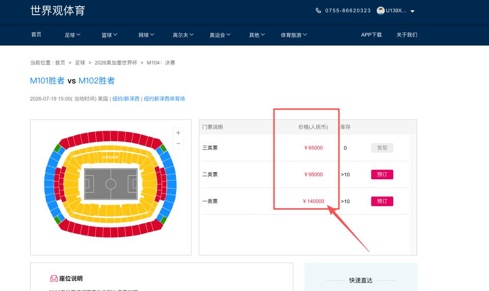 在一家名为 " 世界观体育 " 的票务网站上,记者看到了较为完整的赛事选购流程。从小组赛到半决赛、决赛,各阶段比赛均可购买,票价从 2000 元到 140000 元不等,比赛热度越高,票价随之水涨船高。