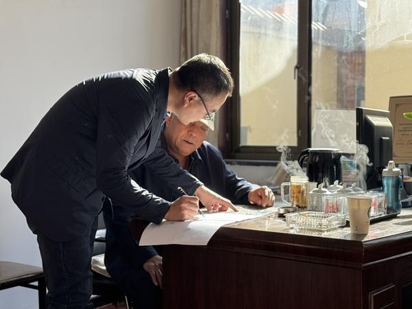 2024 年 11 月 5 日,姚肖刚与柳沟村党支部书记胡宝祥商讨柳沟村乡村奥莱商街项目方案。通讯员 范楷 / 摄