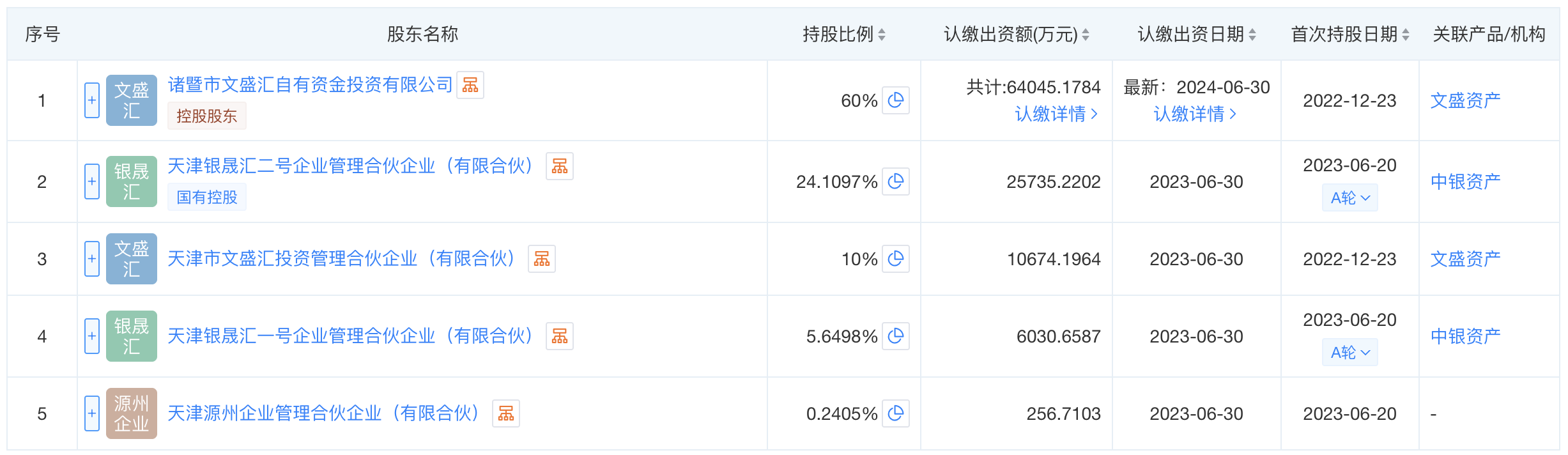 目前北京汇源的控股股东为诸暨市文盛汇自有资金投资有限公司,持股比例为60%,于2022年12月首次持股。第二大股东为天津银晟汇二号企业管理合伙企业(有限合伙),持股比例为24.1%,该公司曾参与了北京汇源的A轮融资,于2023年6月首次持股。北京汇源的实控人为董事长周智杰,其最终受益股份为6.94%。