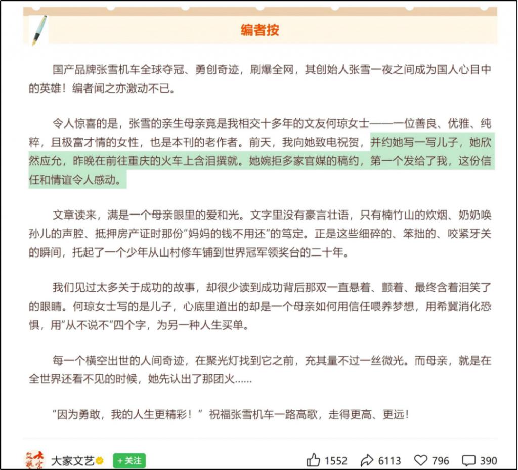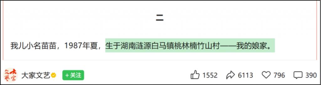 再看看她写了什么。那篇长文里,她写张雪在外婆家出生。注意,此地距张爸家 300 公里,今天开车都要 3 个小时。
