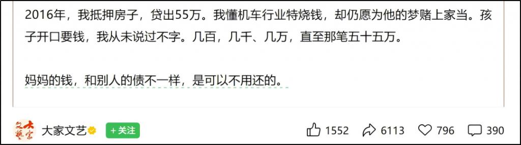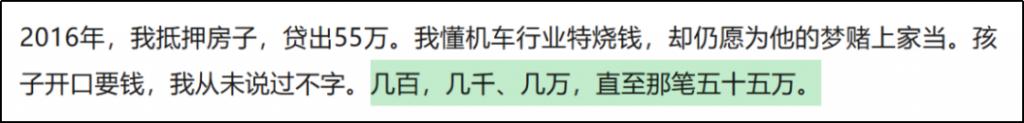 要知道,何女士拿房抵押贷款了 55 万。抵押房子和卖房差别不大,都到了为一个人赌上自己一切的地步。