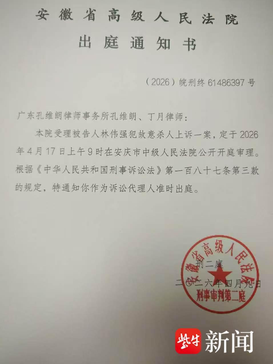 受害人母亲林女士向记者发来了一份《安徽省高级人民法院出庭通知书》,该通知书系告知受害人家属委托的律师出庭,上面内容显示:本院受理被告人林伟强犯故意杀人上诉一案,定于 2026 年 4 月 17 日上午 9 时在安庆市中级人民法院公开开庭审理。