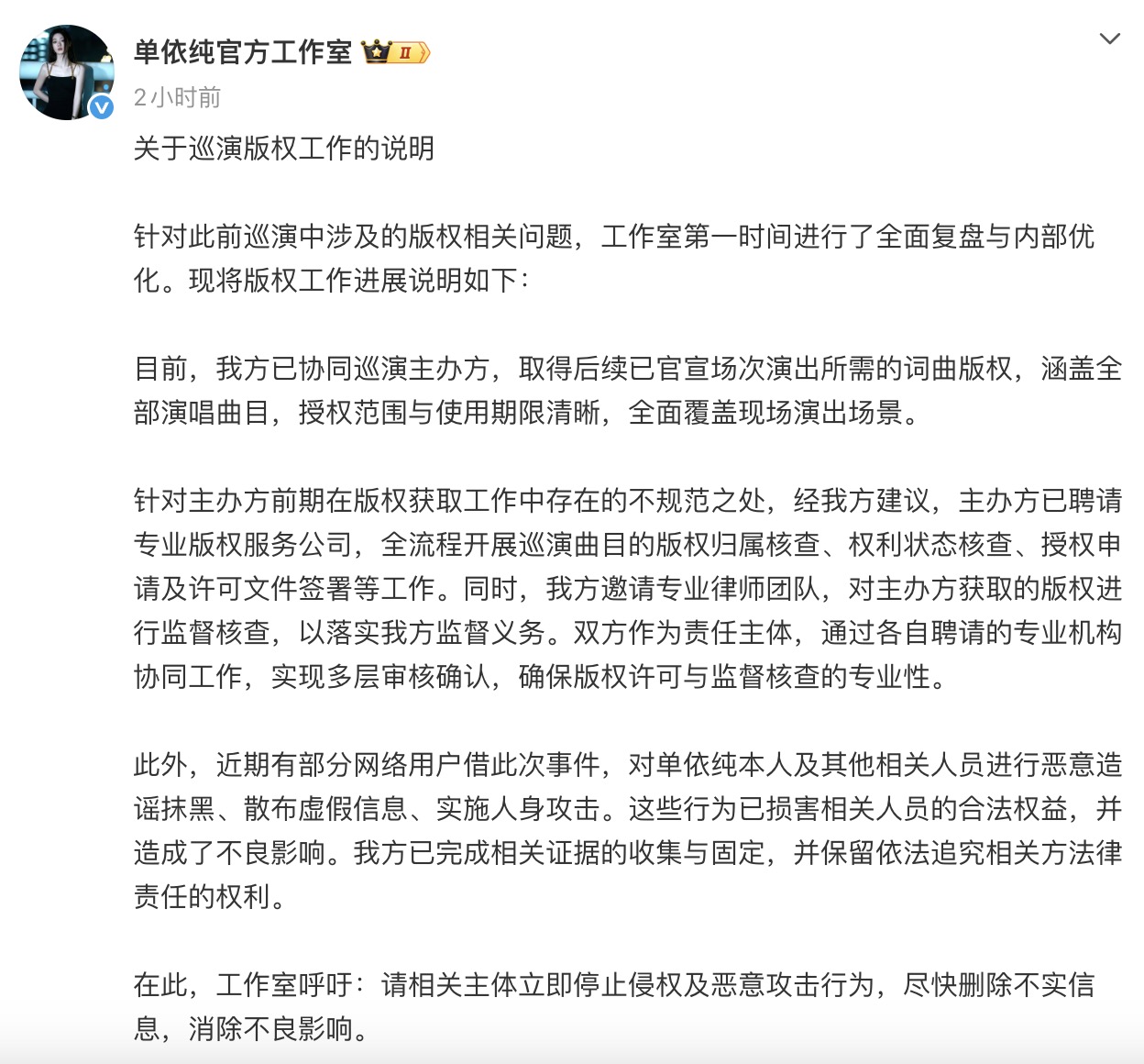 此外,部分网络用户借此次版权争议,对单依纯及相关人员恶意造谣、散布虚假信息、实施人身攻击,已损害其合法权益并造成不良影响。工作室已固定相关证据,保留依法追究相关方法律责任的权利。