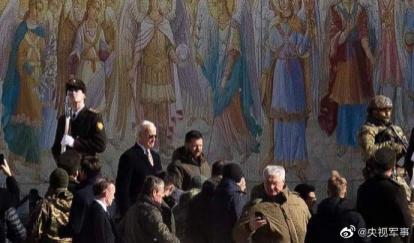 2023 年 2 月时任美国总统拜登访问乌克兰并与泽连斯基一起出现在基辅的东正教堂 图:央视军事微博端