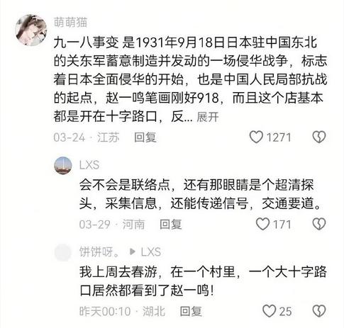 据抖音黑板报转发的网帖,相关谣言在短视频评论区传播较广,形式多样。有的将品牌名称 " 赵一鸣 " 与历史事件进行荒诞关联和影射;有的无端猜测其开设在十字路口的店铺为 " 信息传送点 " 或 " 联络点 ";更有甚者,在品牌卡通形象上做文章,称其 " 眼睛会转圈 " 是 " 超清探头 "。