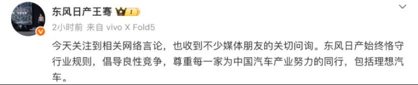 不久后,东风日产汽车销售有限公司新能源品牌总经理王骞隔空回应:" 东风日产尊重每一家同行,包括理想汽车。"