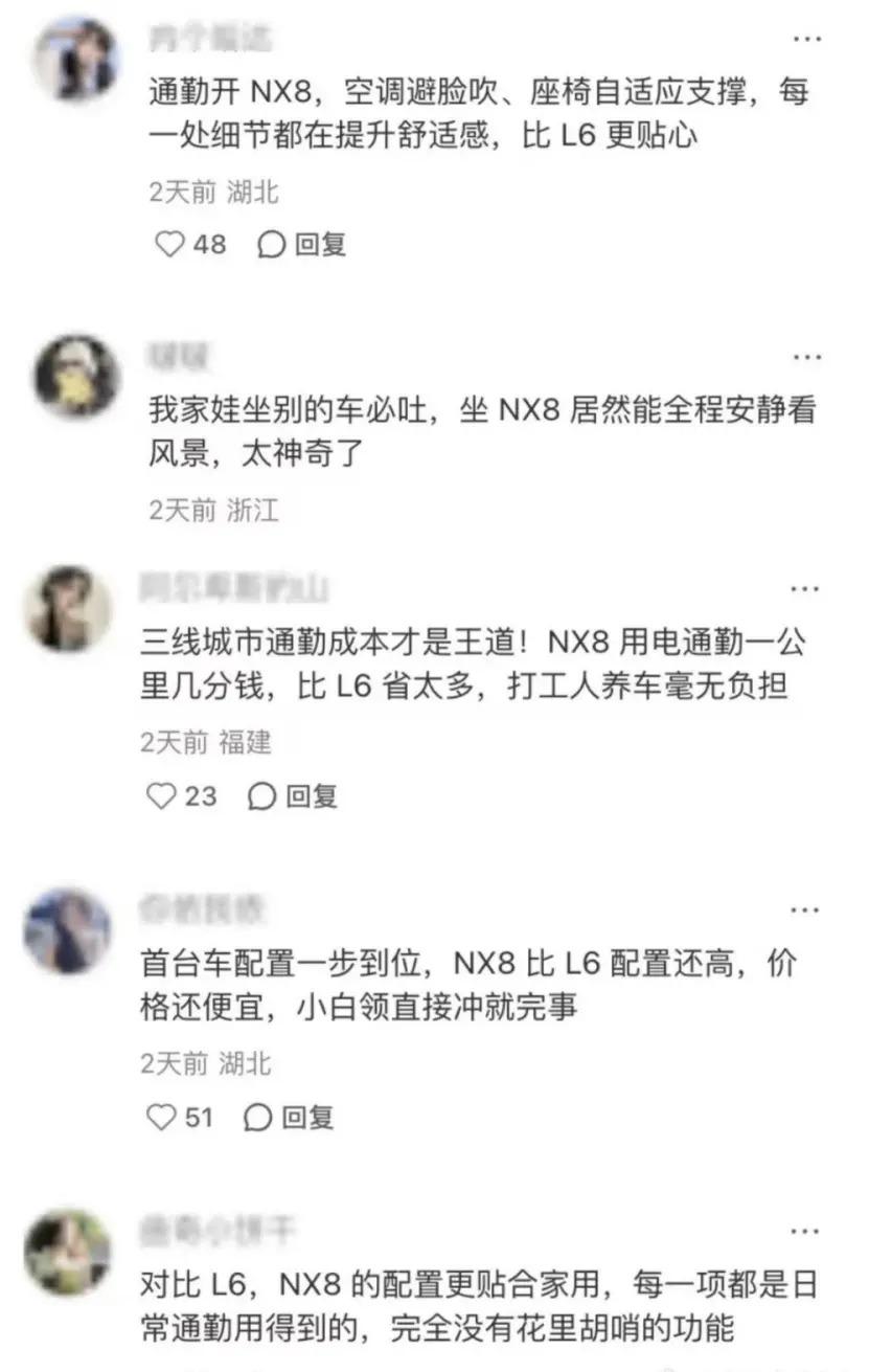 更值得注意的是,这些帖子的文案话术如出一辙,与 " 拉踩式 " 营销的特点高度重合。例如,"NX8 舒适感比 L6 更贴心 ""NX8 通勤成本比 L6 更低 ""NX8 比 L6 配置更高 " 等等。