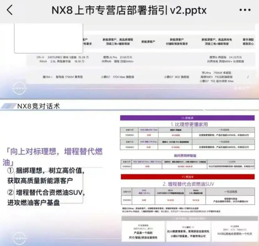 有业内人士向媒体提供了多份来自东风日产内部的传播内容。如在一份东风日产通发专营店的培训材料中,明确标明 " 向上对标理想,增程替代燃油 ",还有诸如 " 比理想更懂家用 " 等话术。
