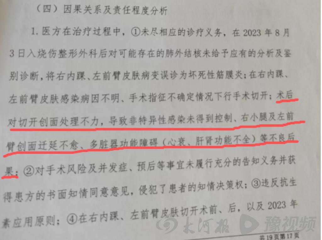 2025 年 2 月,第三份医疗事故鉴定报告明确,医方对病情存在误诊;感染病因、手术指征不确定情况下进行手术;术后对创面处理不力,导致感染失控、多脏器功能障碍(心衰、肝肾功能不全)等;对手术风险等未履行告知,侵犯患者知情决策权;违反抗生素应用原则;确诊皮肤结核后,未见对患者抗结核治疗,违反皮肤结核治疗规范;违反人血蛋白使用规范,对患者治疗期间的容量管理、疾病治疗和预后均存在影响;对患者容量管理、营养支撑、泛血管病等诊治能力不足,加重患者多脏器功能障碍。