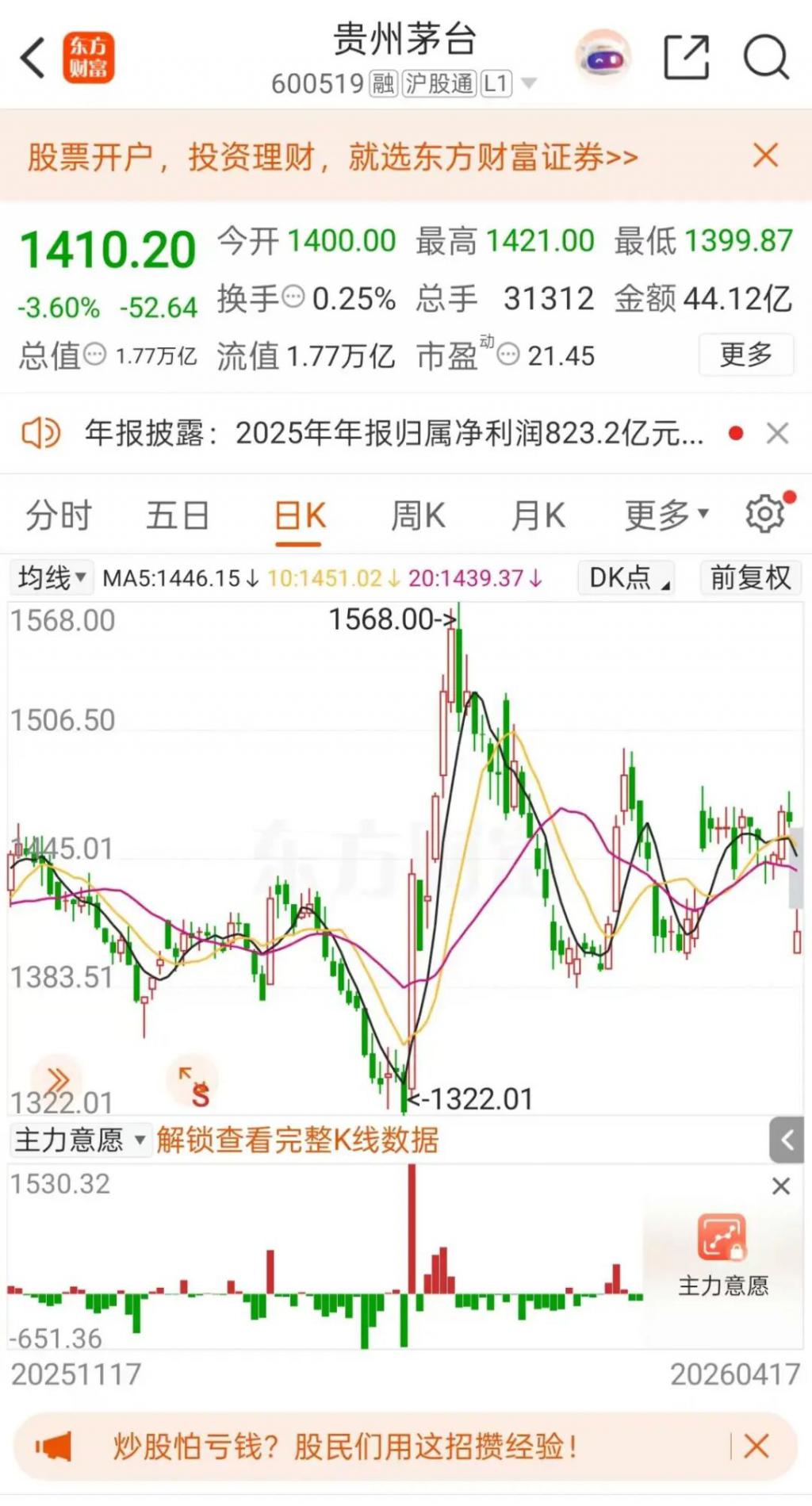 4 月 17 日,受业绩负增长影响,贵州茅台股价表现承压。当日,公司股价低开超 4%,险守 1400 元关口。