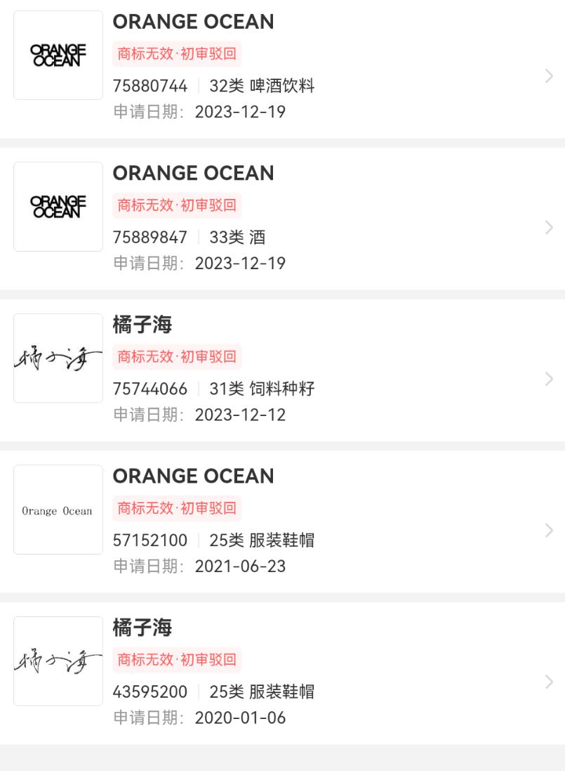 商标信息显示,该公司自 2020 年起,多次申请过 " 橘子海 " 和 "ORANGE OCEAN" 商标,范围涵盖服装鞋帽、饲料种籽、酒、啤酒饮料等,但均遭到驳回。