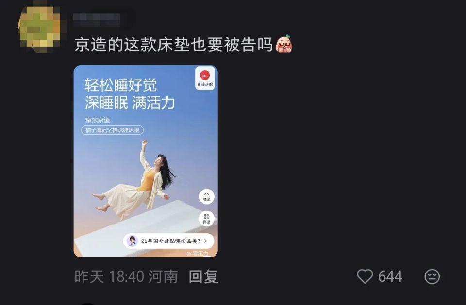有网友晒出了一款京东京造名称中带有 " 橘子海 " 一词的床垫,表示 " 这也要被告吗?"