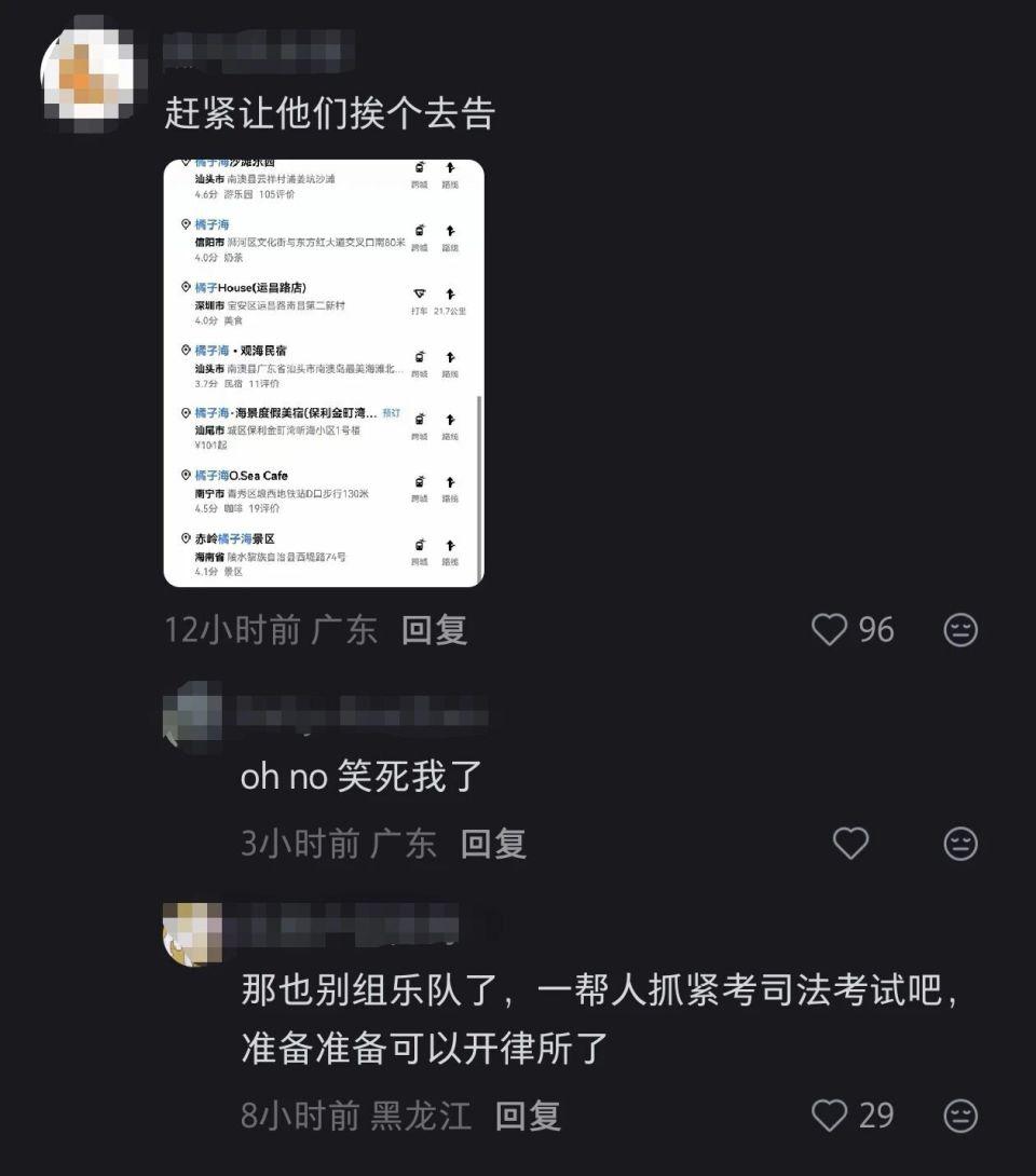 更是有人直接晒出地图软件关键词 " 橘子海 " 搜索结果,能够搜到多个名字带有 " 橘子海 " 的地点。