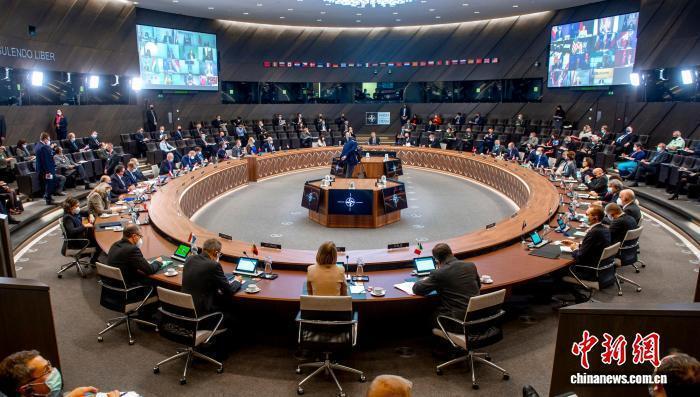 2022 年 1 月 7 日,北约举行成员国外长特别会议,商讨俄罗斯与乌克兰边境地区局势。北约秘书长斯托尔滕贝格重申,北约仍对俄罗斯奉行 " 防御 + 对话 " 的双轨方针,且在局势紧张之际," 对话更为重要 "。图为特别会议会场。 中新社发 北约 供图
