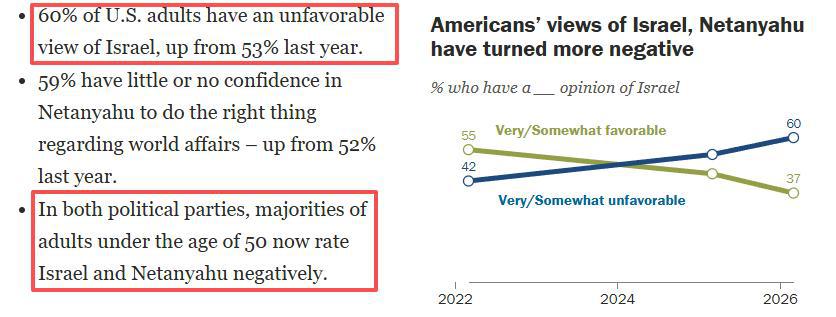 民意层面,皮尤研究中心近期的民调结果显示,60% 的美国成年人对以色列持负面看法,高于去年的 53%。无论党派归属,50 岁以下成年人中的大多数受访者对以色列及其总理内塔尼亚胡的评价都是负面的。
