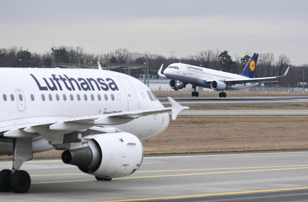 2022 年 1 月 17 日,两架汉莎航空公司的飞机抵达德国法兰克福机场。新华社记者逯阳摄