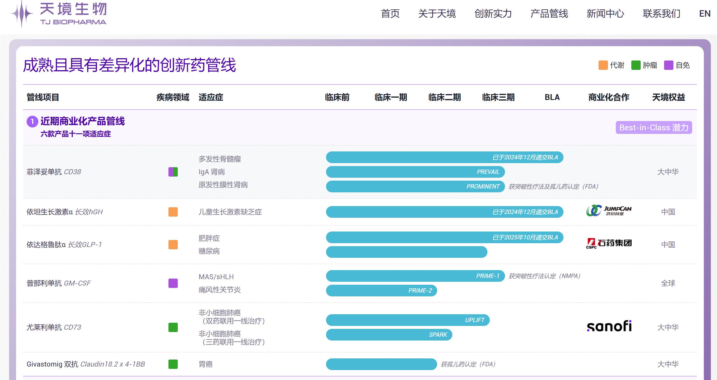 目前,天境生物正聚焦推进普那利单抗和尤莱利单抗(自研CD73抗体,赛诺菲负责商业化)等多个注册性临床或后期临床;第二梯队产品,如TJ-C64B、TJ-L1IF、TJ-MC203等也将逐步进入临床开发阶段。